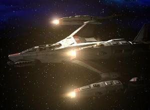 The base model, shown above and immediately below, is equipped for space combat and patrols only. It has four wings, two on each side, with fore and aft engines on each wing. In the center is the cockpit, along with its only weapon, a plasma ball cannon, below the cockpit. The ship is quite maneuverable, able to rotate 180 degrees in about 1 second.